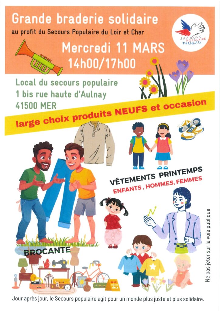 Le Secours Populaire du Loir-et-Cher organise une grande braderie mercredi 11 mars de 14h à 17h dans ses locaux, au 1 bis rue Haute d’Aulnay à Mer.